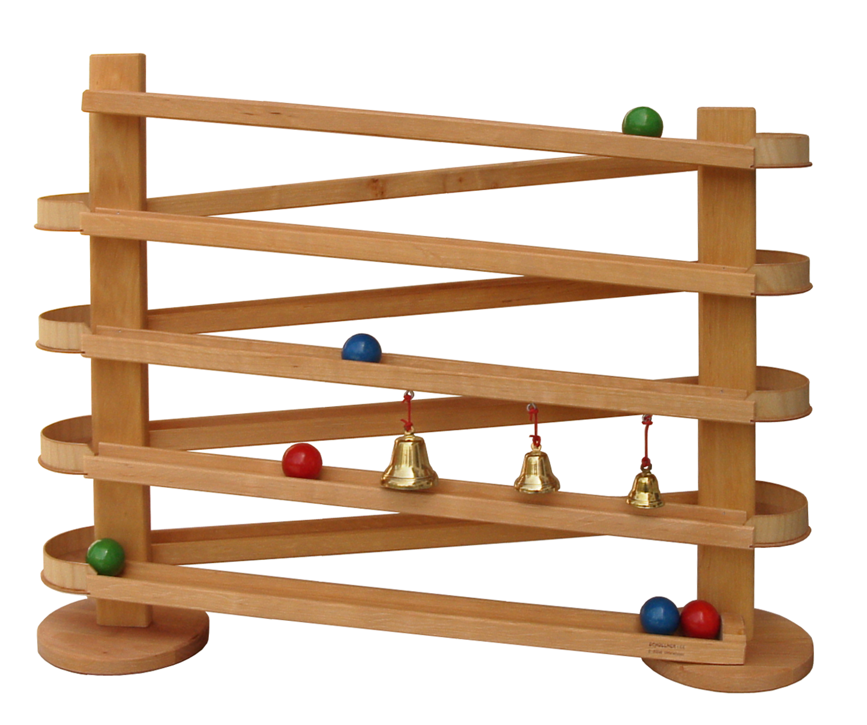 Über eine Wellenbahn kann man die Kugeln an den drei Glocken vorbei bis in ihr Ziel verfolgen.