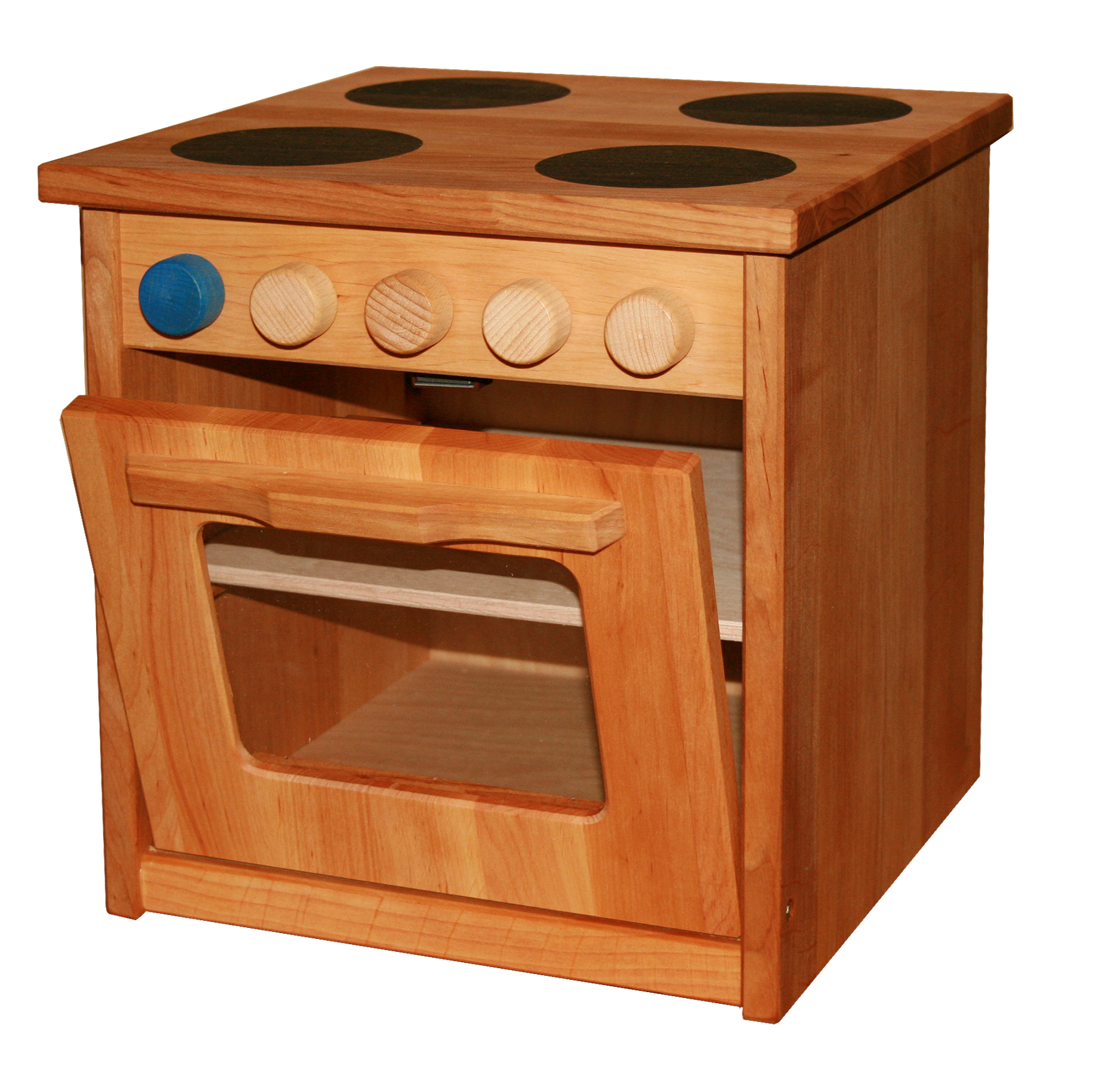 Großer, stabiler Ofen aus geöltem Erlenholz mit fünf drehbaren Reglern für die Herdplatten und die Backröhre.